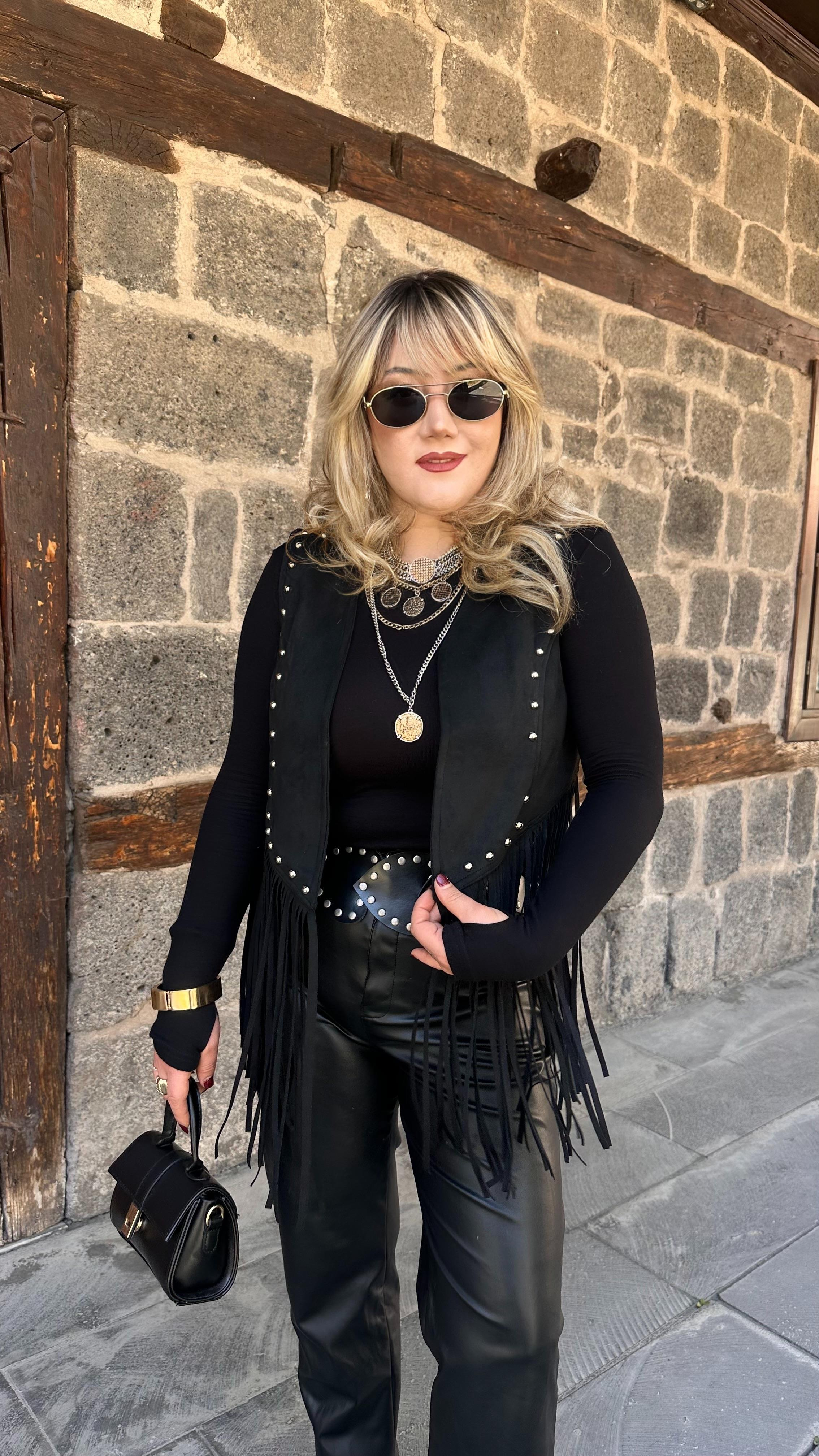 DROP DETAYLI PÜSKÜLLÜ NUBUK YELEK SİYAH