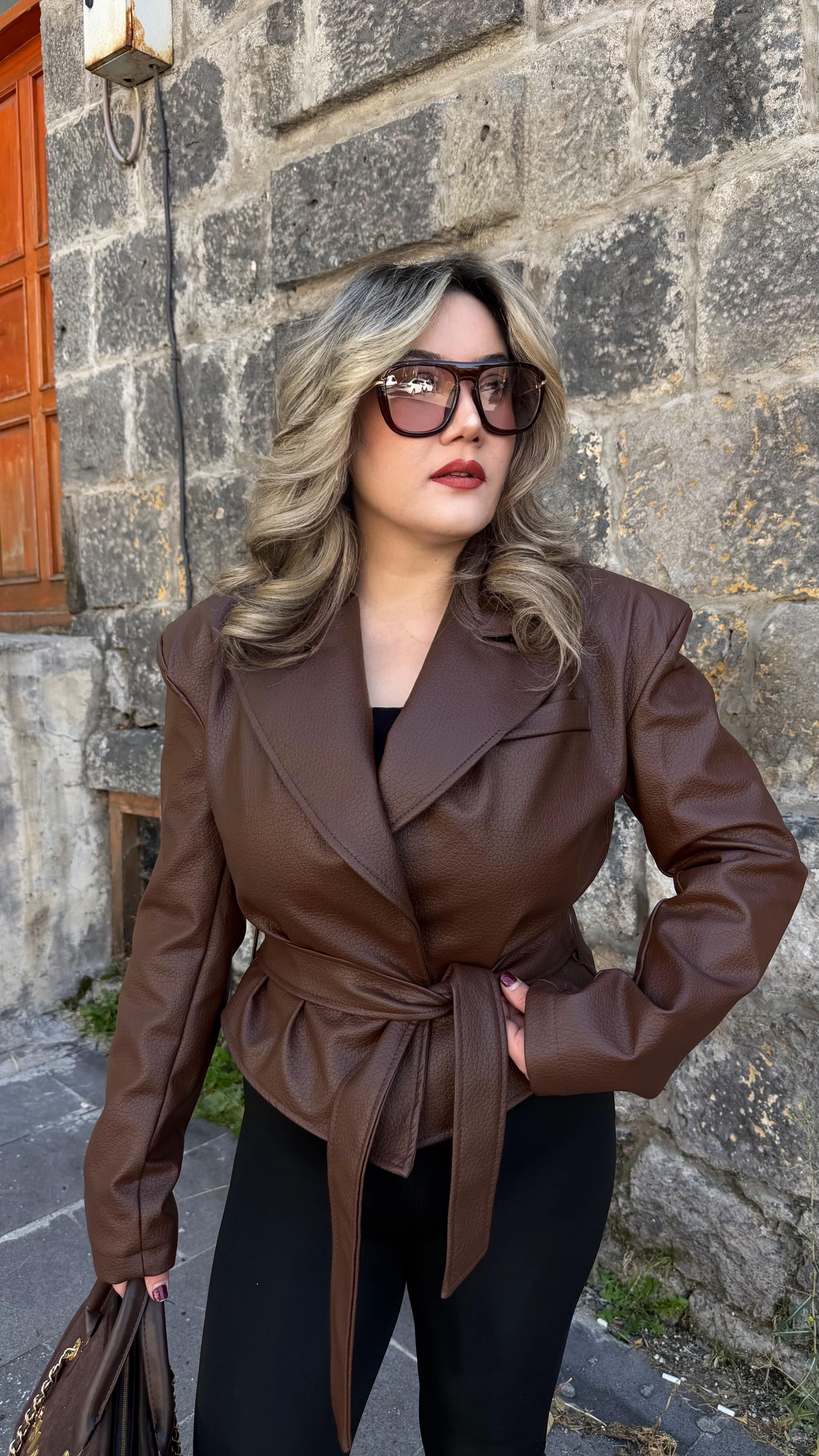 KUŞAKLI VATKA DETAYLI MAT DERİ CEKET KAHVE