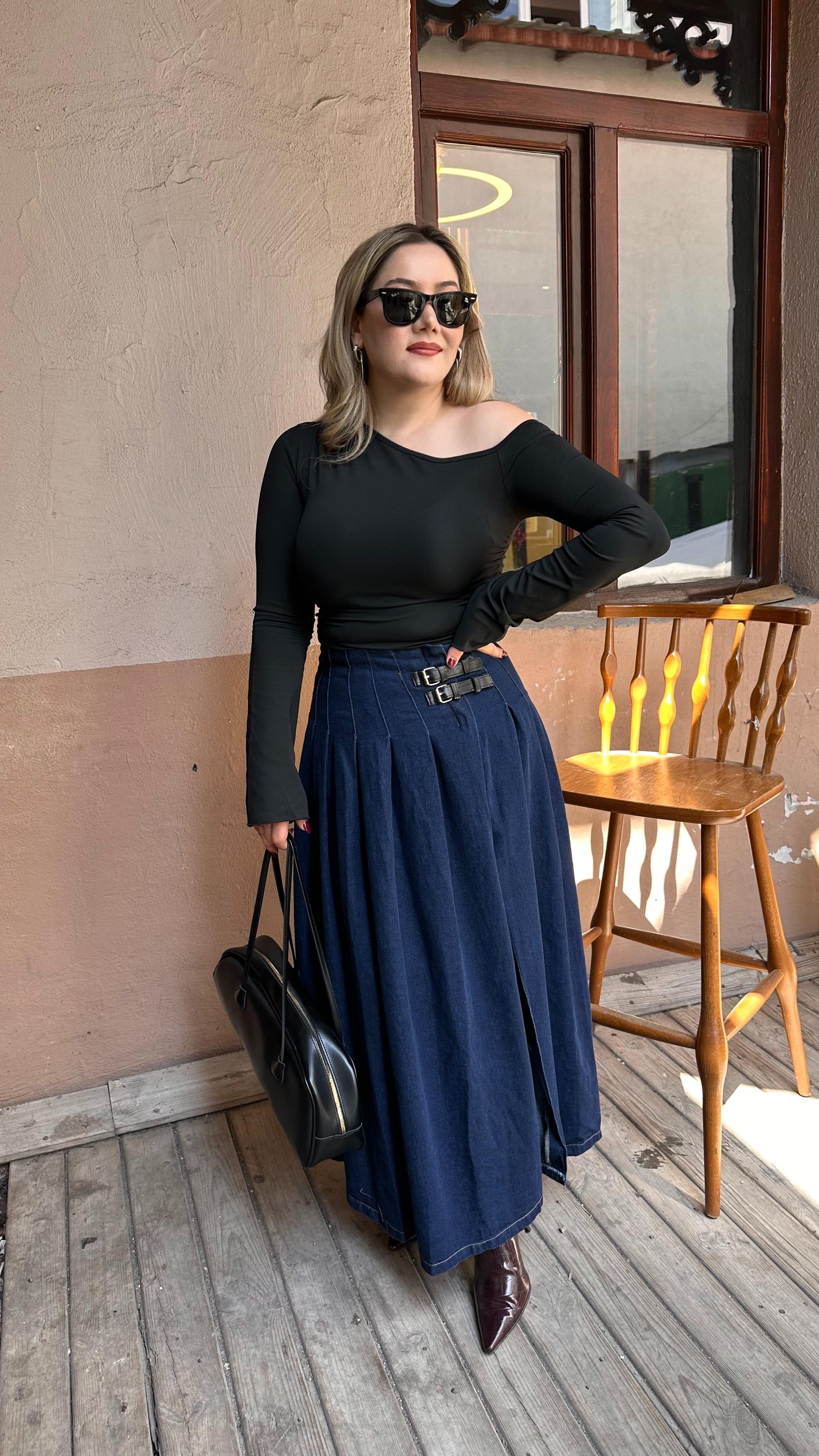 YÜKSEK BEL KEMERLİ YAN YIRTMAÇLI JEAN ETEK