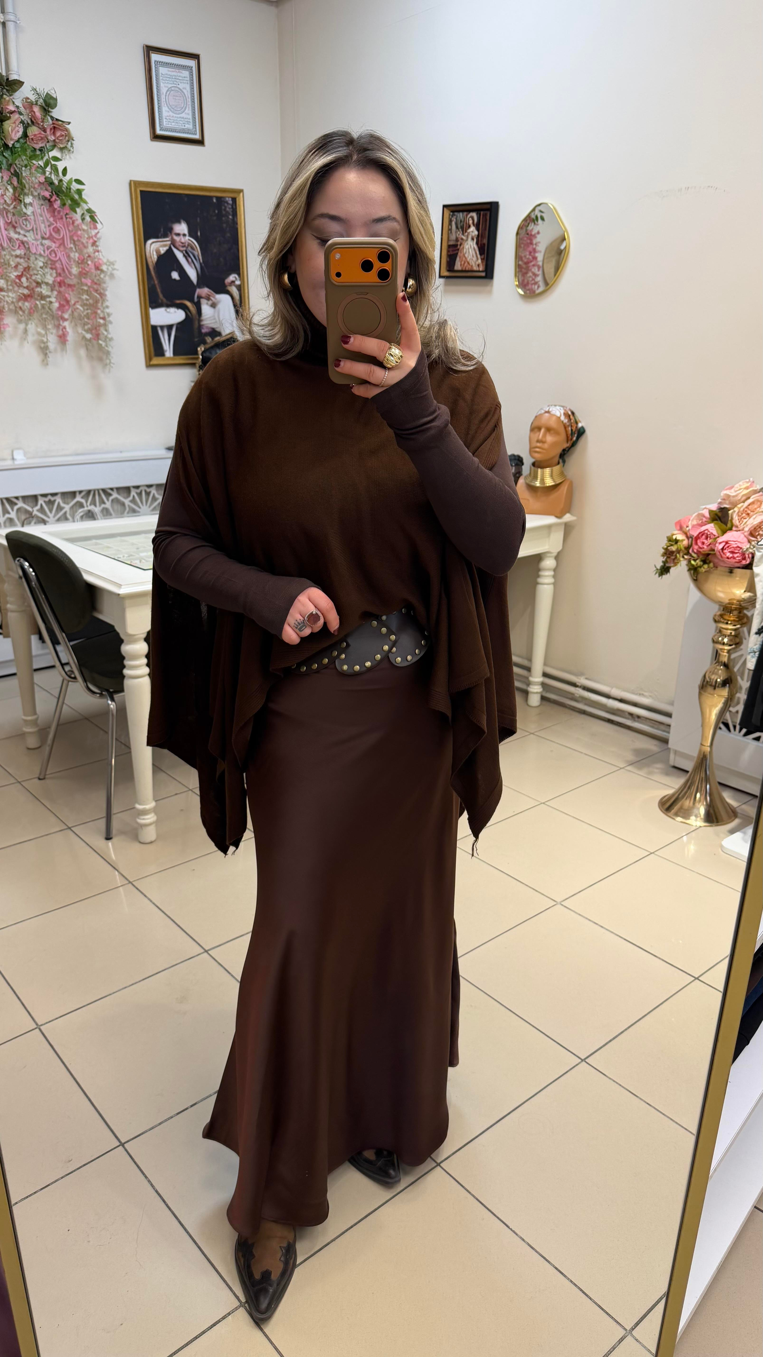 YÜKSEK BEL LASTİKLİ PAMUK SATEN ETEK KAHVE